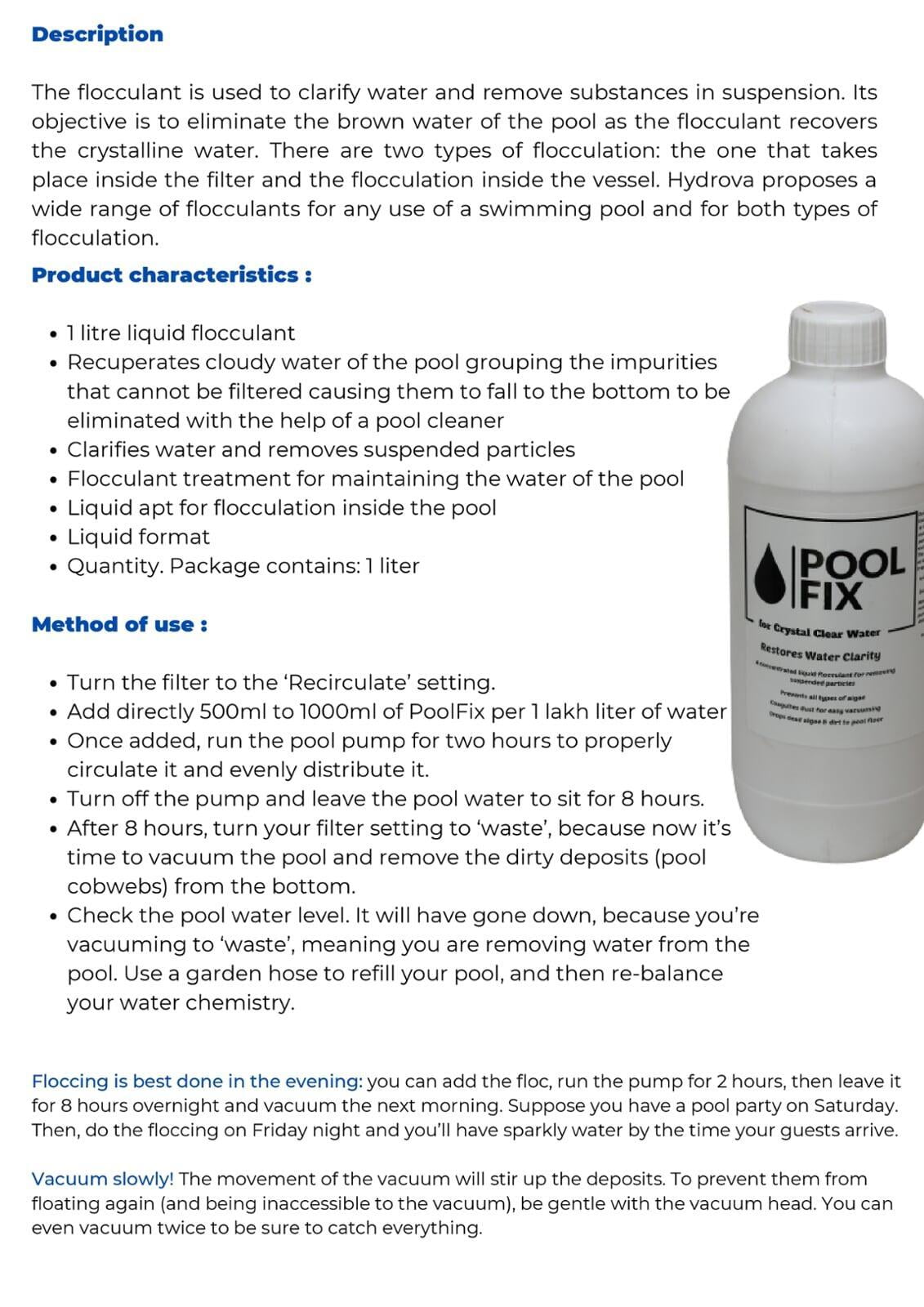 Use of Hydrova's Pool Fix in the pool creates a gel-like substance in the water that causes microscopic suspended particles to clump together and sink to the bottom of the pool. Once all the particles have settled out of the water, these can be readily vacuumed from the pool and disposed down the waste drain. The role of this Pool Fix in swimming pool applications such as sand, silt, clay, dead algae, etc. that are too small to be trapped by the pool filter.